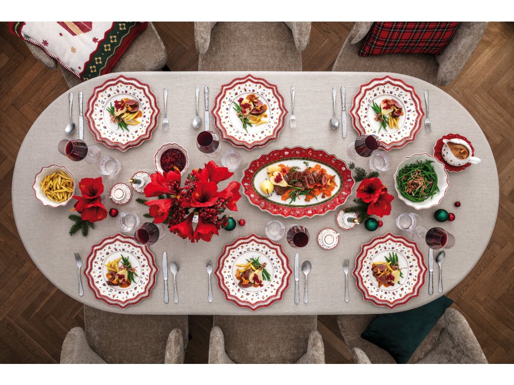 Oválný servírovací talíř o rozměrech 38 × 23 cm je perfektní pro servírování slavnostních pokrmů. Krásně doplní vánoční tabuli a stane se výrazným prvkem vašeho servisu – praktický i dekorativní zároveň.